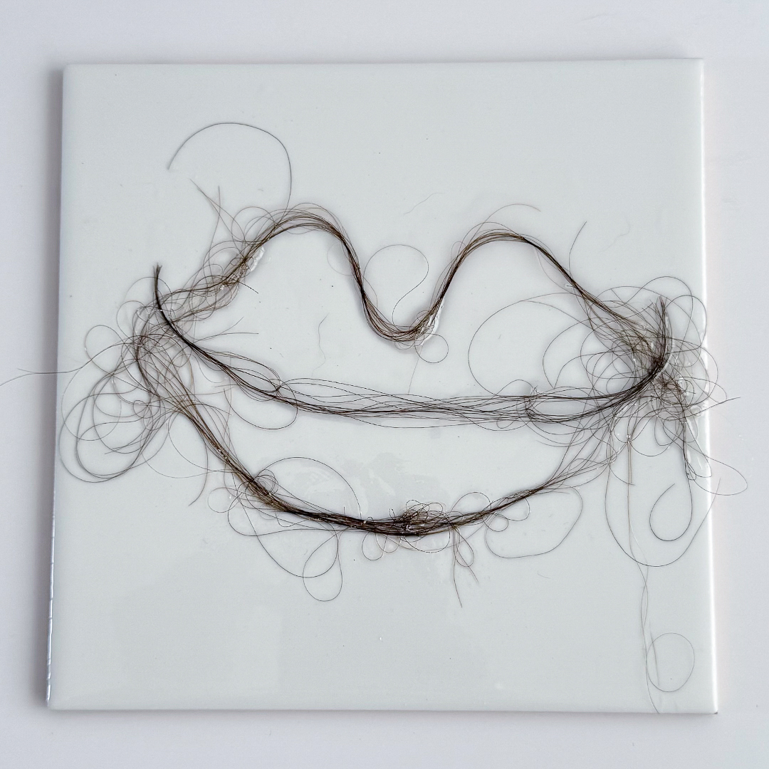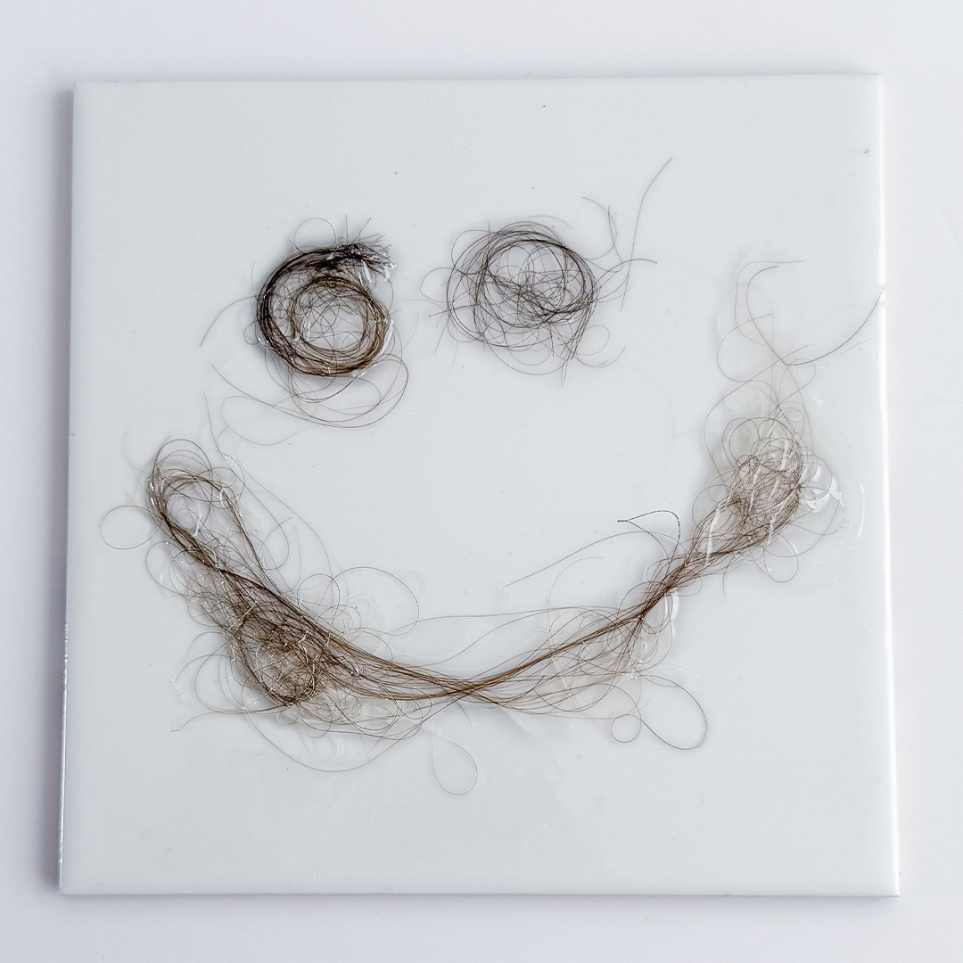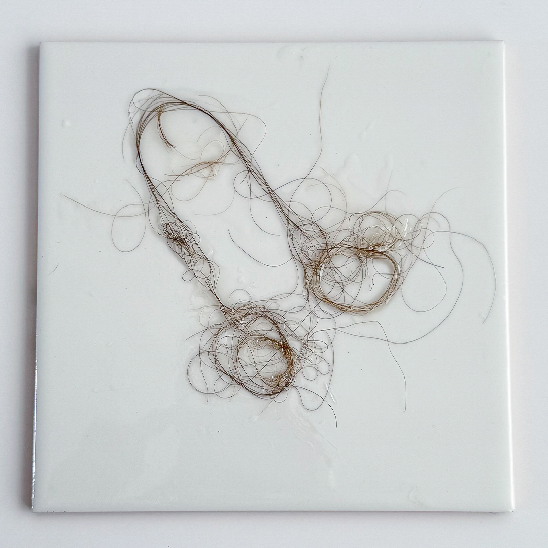 9 Azulejos con dibujos hechos en pelo natural de mi novia y míos en resina.