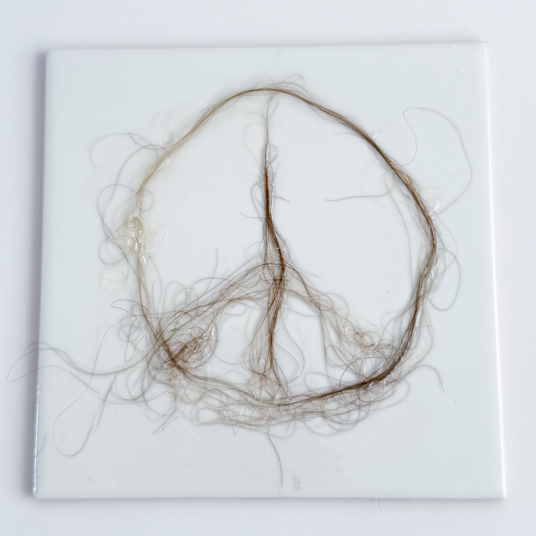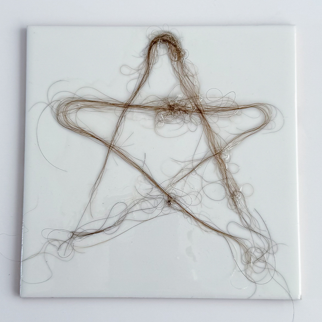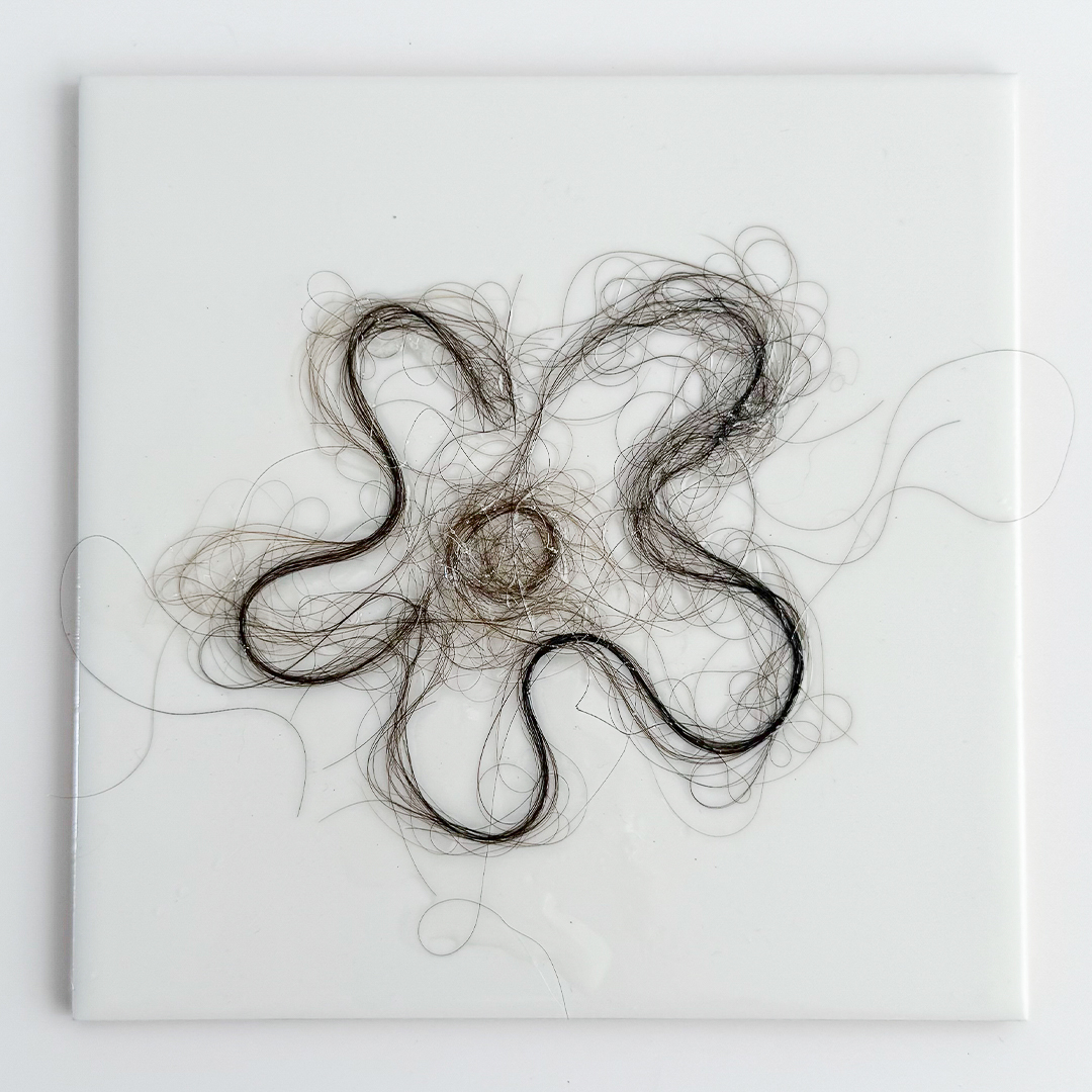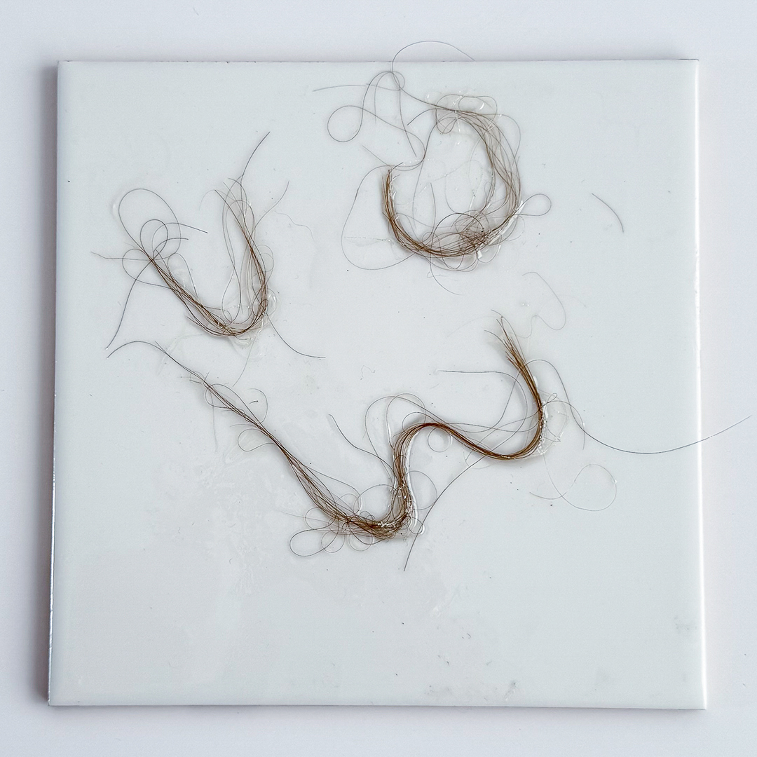 9 Azulejos con dibujos hechos en pelo natural de mi novia y míos en resina.